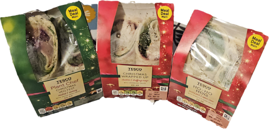 Christmas wrapped up: This had the enjoyable meaty flavours and textures I enjoy in a festive sandwich, but it just wasn’t as enjoyable. Wraps often aren’t, because you usually get one side packed with flavour and then the other part which misses out. Also, my wrap had NOTHING at the end, so I was chewing through hard wrap on its own. The joys. 3/5. My daughter wasn’t sold on this either; she didn’t thumbs down, but she left it, which tells a lot from my mini me. 1/5.