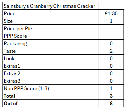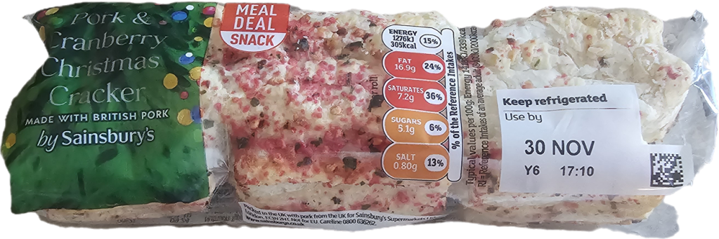 I’m also going to review their ‘Pork & Cranberry Christmas Cracker’ which is a sausage roll, with indentations where are Cracker would have them, for handles.